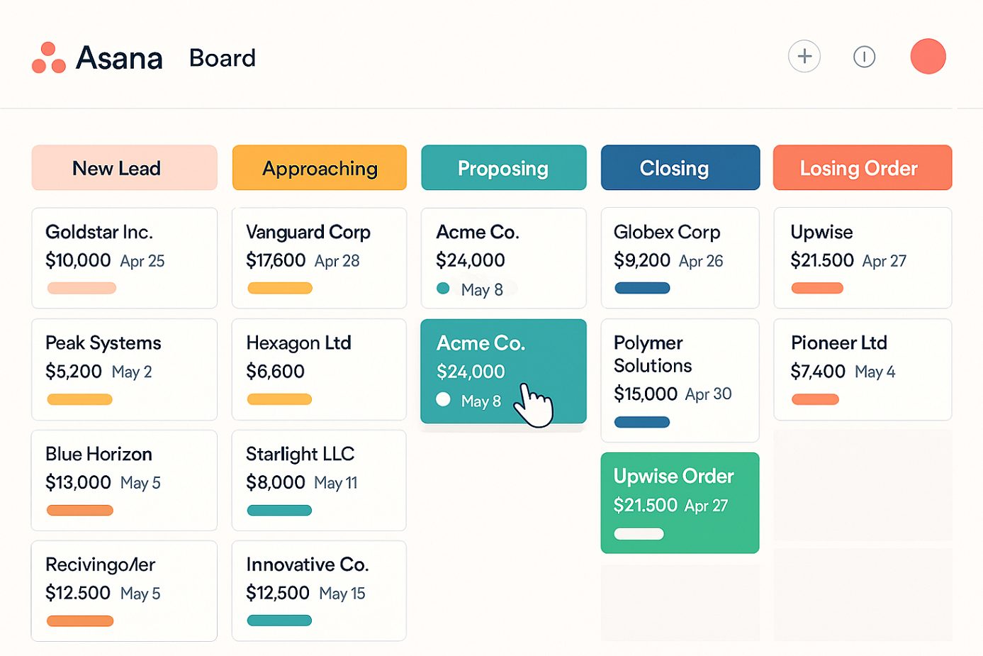 まず、Asanaで「商談管理」プロジェクトを作成します。カンバン形式の「ボードビュー」を使えば、「新規リード」「アプローチ中」「提案中」「クロージング」「受注」「失注」といった営業フェーズを列として視覚的に管理できます。