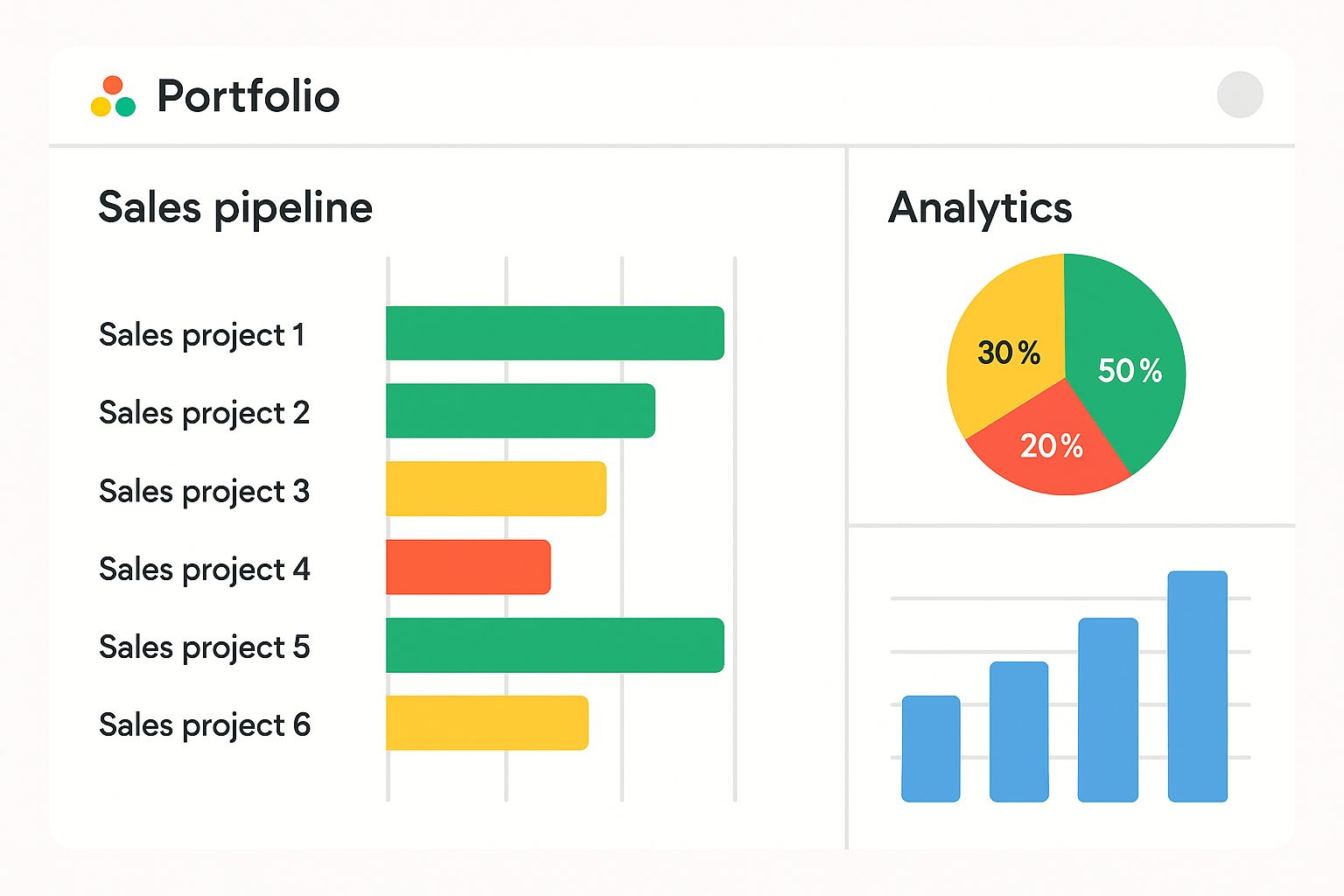 個々の案件がタスクとして管理されたら、次はマネージャーの出番です。「ポートフォリオ機能」は、複数のプロジェクト(例えば、チームメンバー全員の商談管理プロジェクトや、製品別のパイプラインプロジェクト)を束ねて、パイプライン全体を鳥の目で俯瞰できる機能です。