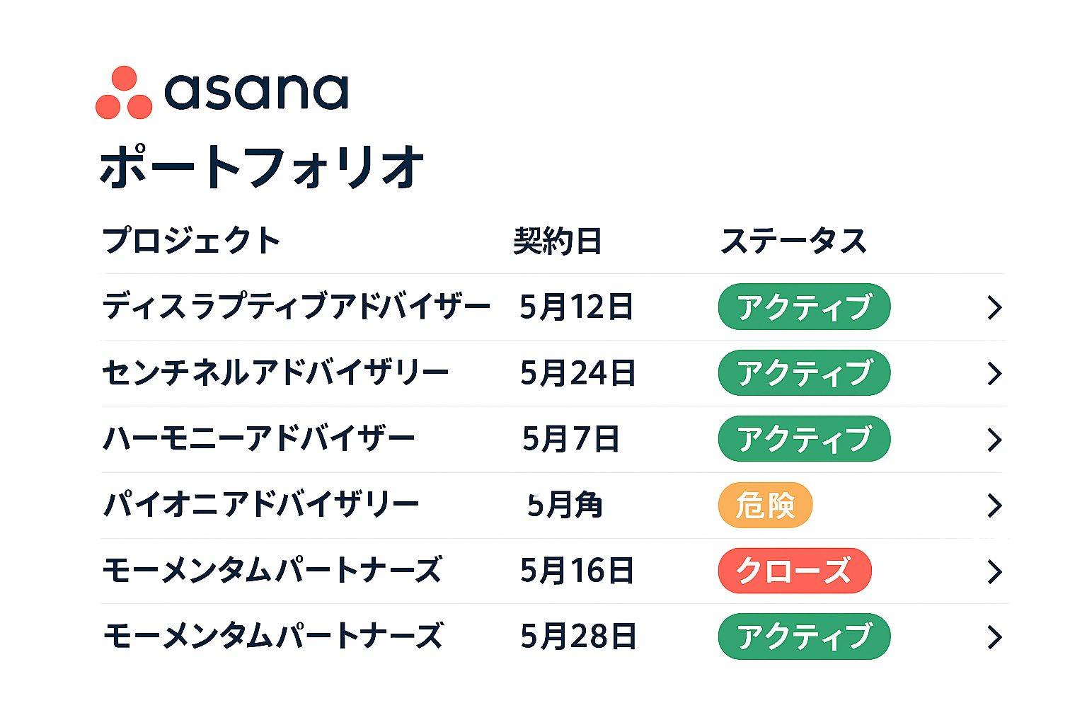 まず、顧問先一社一社をAsanaの「プロジェクト」として作成し、それら全てを「ポートフォリオ」機能で束ねます。これにより、事務所が抱える全ての顧問先案件の状況を、経営者やマネージャーが一つの画面で鳥瞰できるようになります。