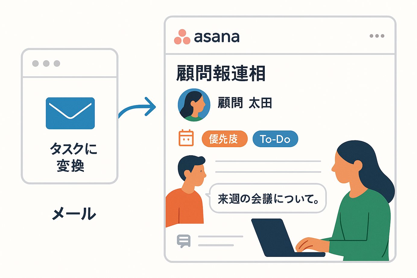 顧問先からのメールでの依頼や質問も、Asana連携機能を活用すれば、ワンクリックでAsanaのタスクに変換できます。電話での相談内容も、担当者が即座にタスクとして起票します。