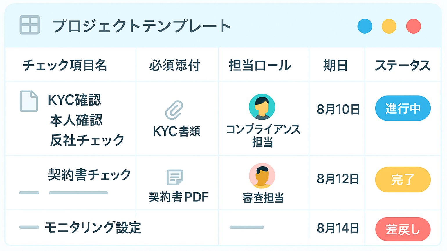 まず、金融機関における定型的で厳格な業務プロセス(例:「新規口座開設プロセス」「反社チェック業務」「新金融商品開発承認フロー」など)を、Asanaの「プロジェクトテンプレート」として定義します。このテンプレートには、規制や内部規定で定められた全てのチェック項目や承認ステップを「タスク」および「サブタスク」としてあらかじめ組み込みます。