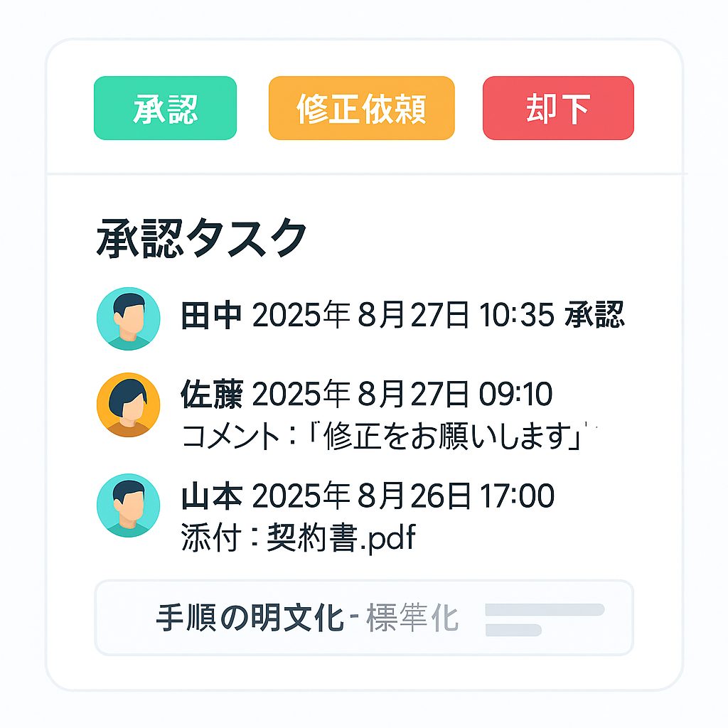 金融商品の組成、融資実行、コンプライアンスチェックなど、多くの業務には多段階の承認と、数十項目に及ぶチェックリストが伴います。これらのプロセスが、今なお紙の稟議書への押印リレーや、担当者間のメール転送によって行われていると、プロセスは著しく遅延します。どこで承認が滞っているのか、誰がボールを持っているのかが見えないため、ボトルネックの特定も困難です。
