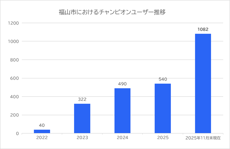 Asanaは、管理画面にてユーザーの利用状況やパフォーマンスを数値化して確認することができます。こうした意識変革の広がりは、Asanaの活用度が高い「チャンピオンユーザー」の推移にも表れています。チームをリードしながらAsanaを使いこなすパワーユーザーの数は、2022年度の40名から2025年11月末時点で1,082名へと約27倍に増加。当初は一部の推進メンバーに限られていた積極的な活用が、3年余りで組織全体へと着実に浸透していることが分かります。