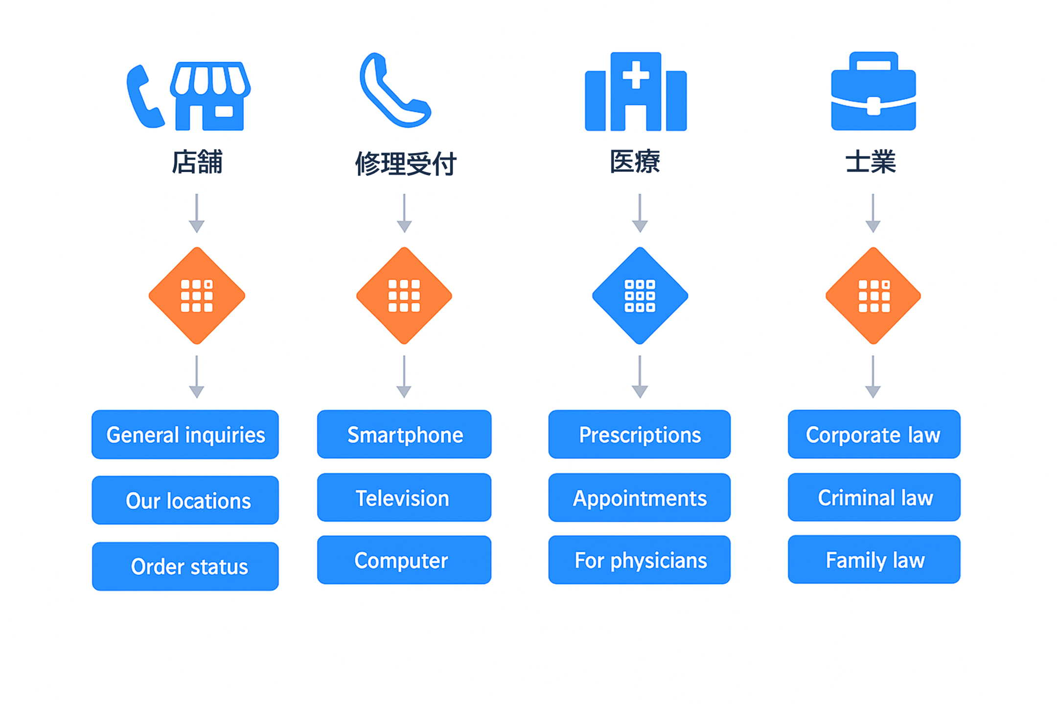 士業事務所では、相談予約や手続きの問い合わせなど、業務内容が多岐に渡ります。特に「今すぐ弁護士と話したい」といった緊急対応が必要な場合、しっかりと分類しないと他業務が圧迫されてしまいます。 ▼ IVRシナリオ例: